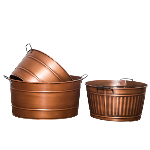 Description: Cuves cuivrées en métal étanche parfaites pour le service de boissons. Remplissez-les de glace, et déposez bouteilles et canettes! Photo du produit en situation par Francis Fraioli.