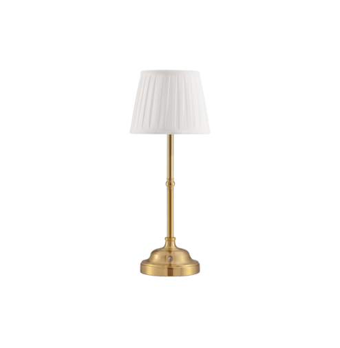 Description: Avec son abat-jour en tissu plissé, sa base ronde en métal doré et son design délicatement travaillé, cette lampe à DEL rechargeable évoque le charme des établissements élégants et traditionnels.